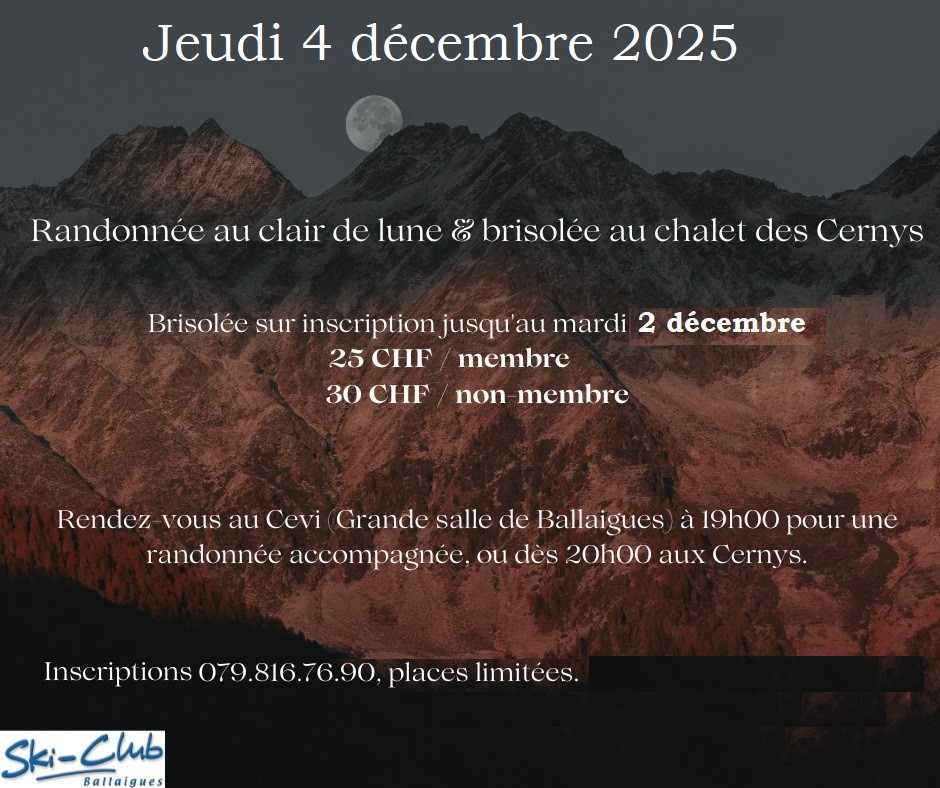 Rando Clair de lune – Brisolée par Joël Guillaume | Déc 4, 2025 | Rando Clair de lune Date/heure Date(s) - 04.12.202519h00 - 22h00 Emplacement Chalet des Cernys Catégories Rando Clair de lune